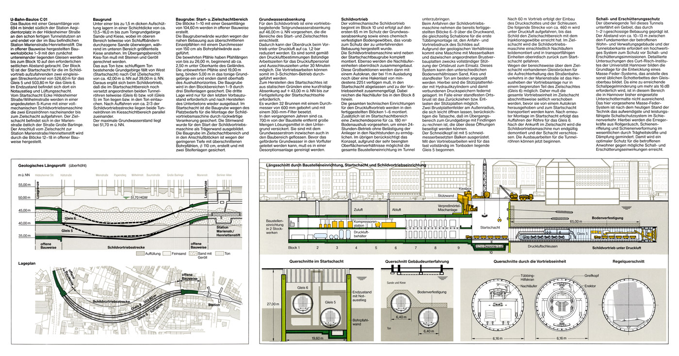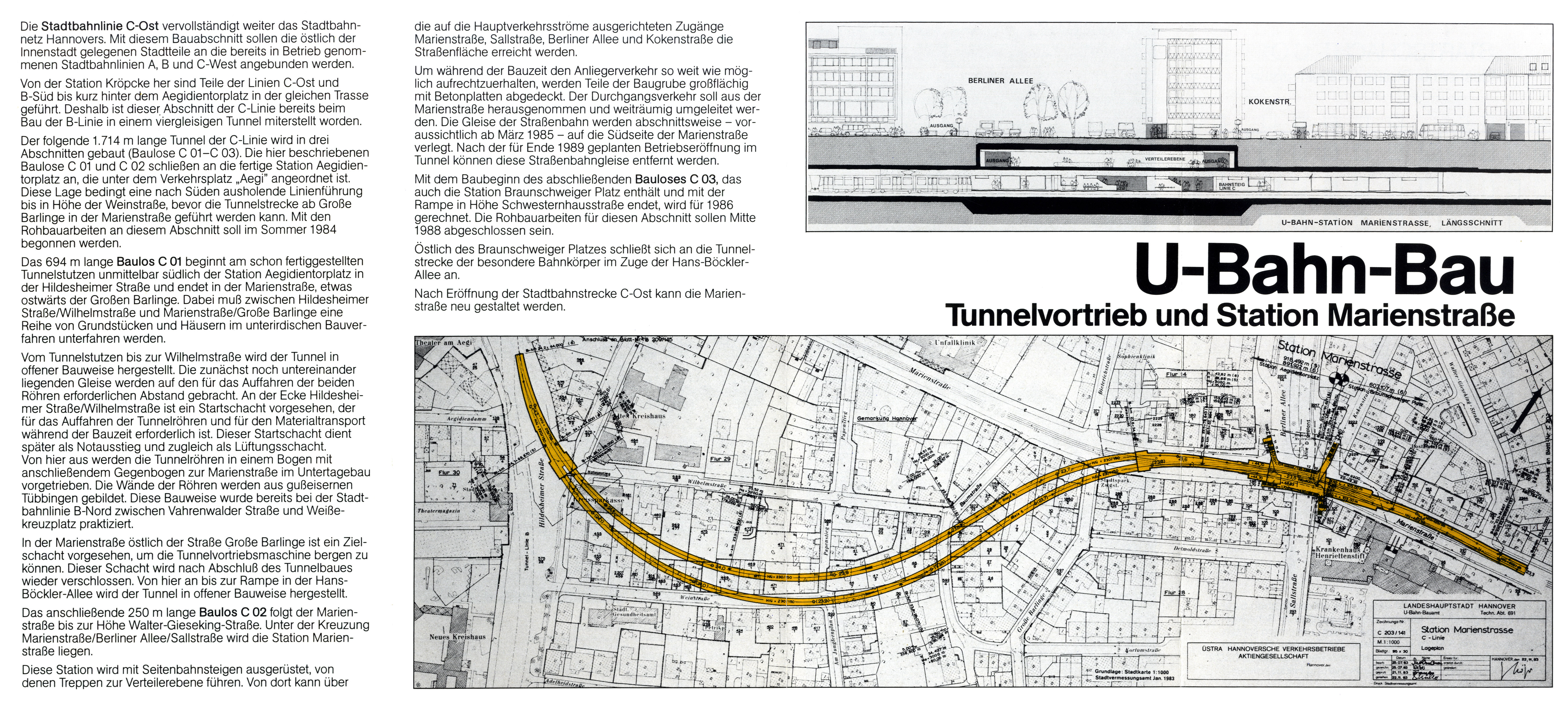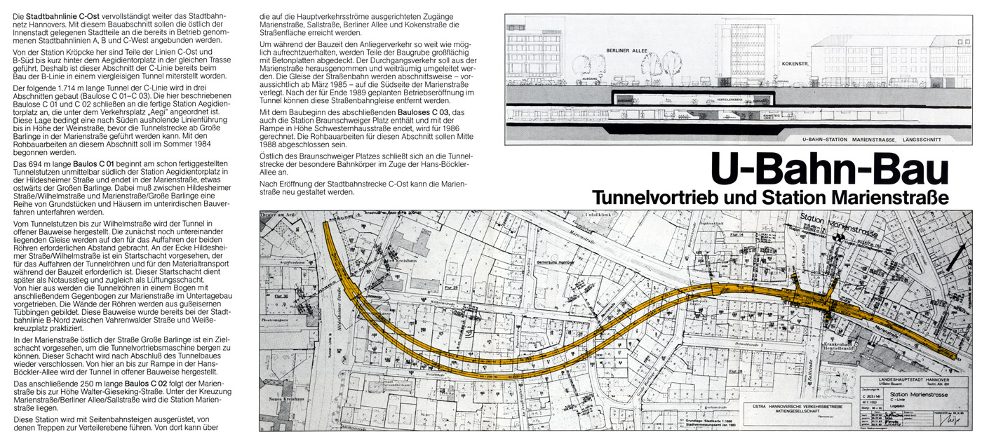 In dieser Infobroschüre aus dem Jahr 1986 wird das Baulos C 01 Schildvortrieb (Aegi Richtung Marienstraße) detailliert vorgestellt, inklusive detaillierten technischen Zeichnungen, Längsprofil und Querschnitte der Strecke.