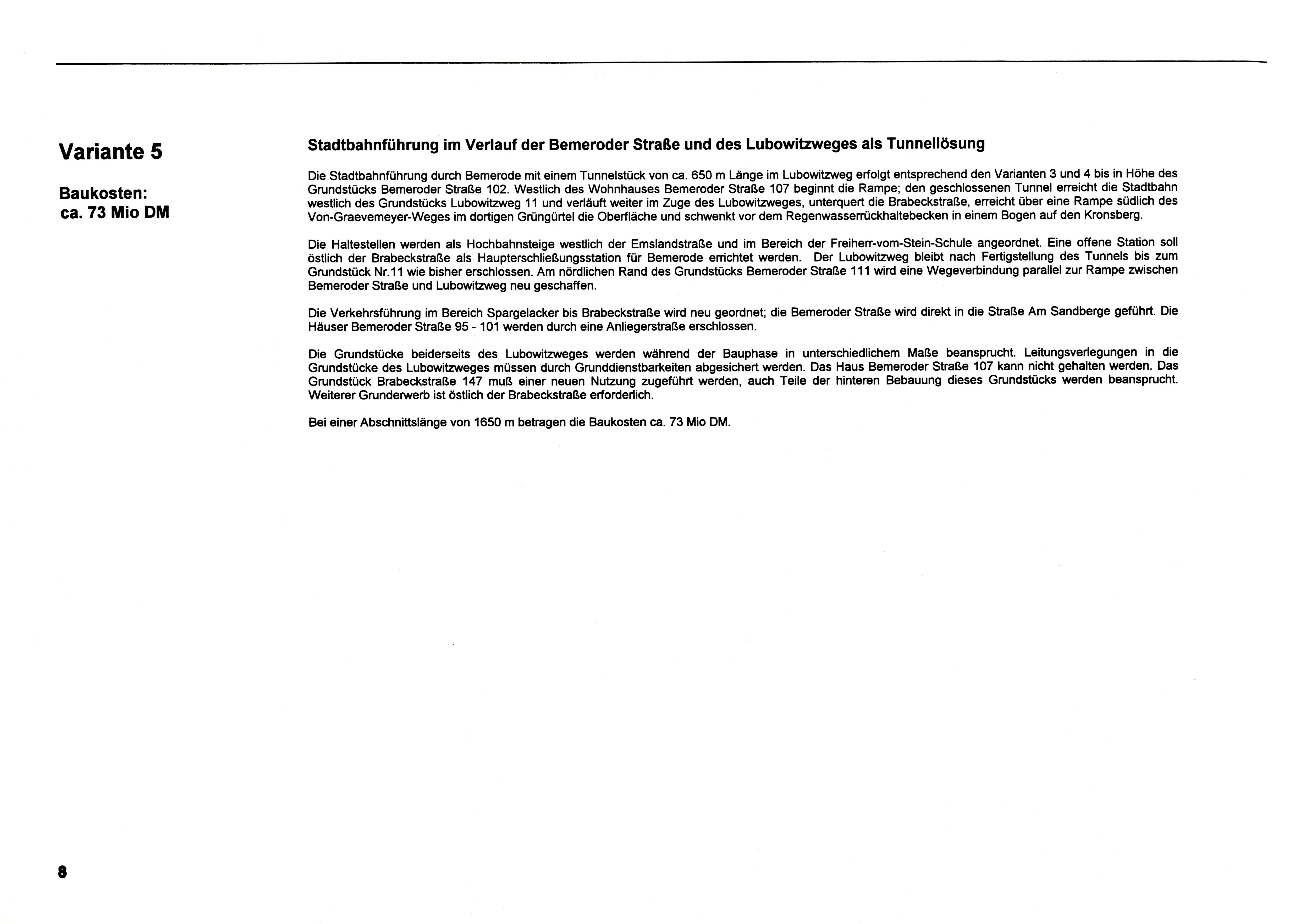 In dieser Infobroschüre aus dem August 1993 stellt das U-Bahn-Bauamt den Verlauf der Linie D durch Bemerode mit fünf verschiedenen Varianten zur Diskussion. Neben einer komplett oberirdischen Straßenbahntrasse wird hier auch die ausgeführte Tunnelvariante angesprochen. Die Broschüre ist eine Farbfotokopie.