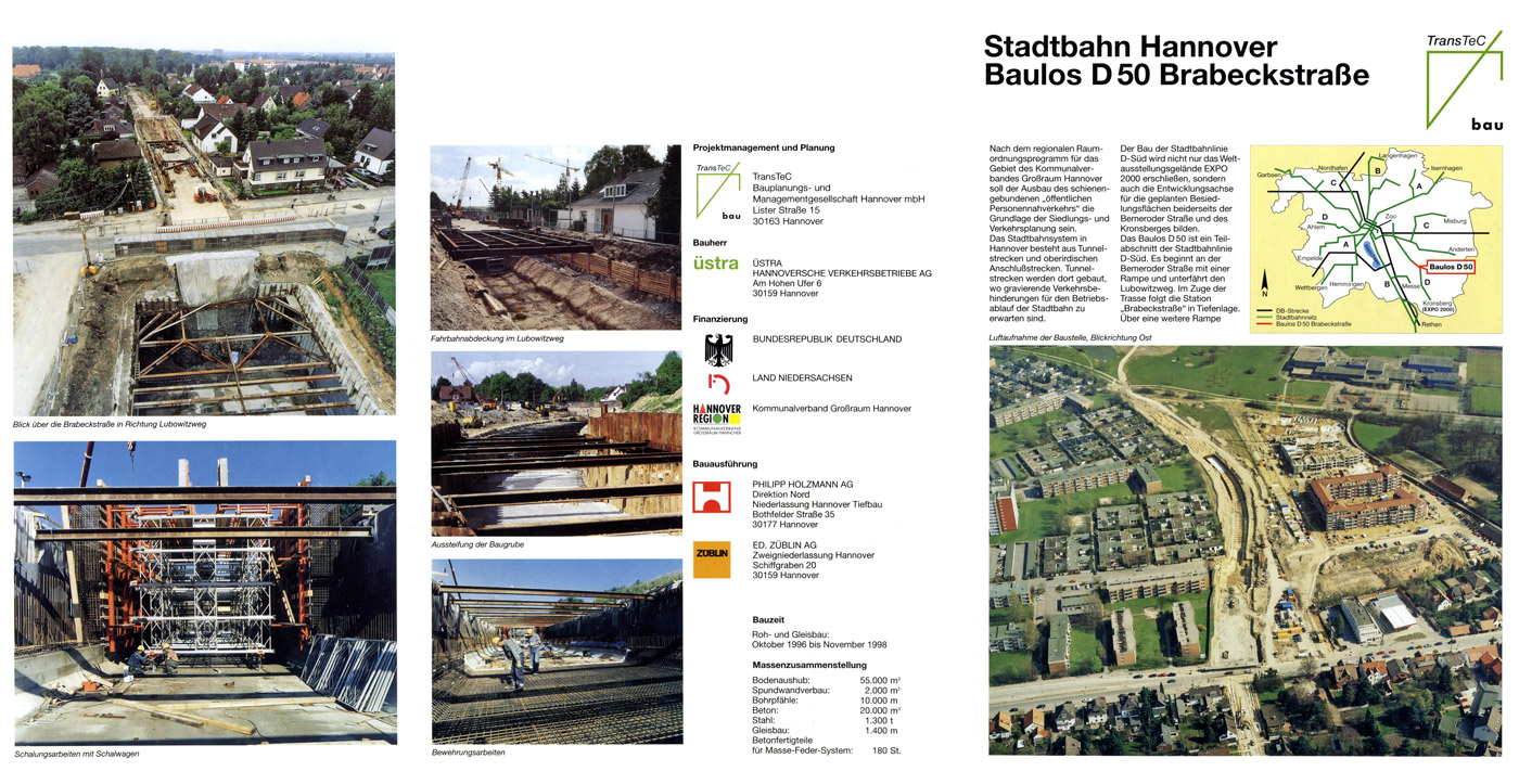 In dieser Infobroschüre, vermutlich aus dem Jahr 1998, wird der Baustellenfortschritt auf dem Baulos A 50 Brabeckstraße mit dem Tunnel Lubowitzweg und der Station Brabeckstraße gezeigt. Lagepläne, Schnitte und ein Bauzeitenplan runden die Info ab.